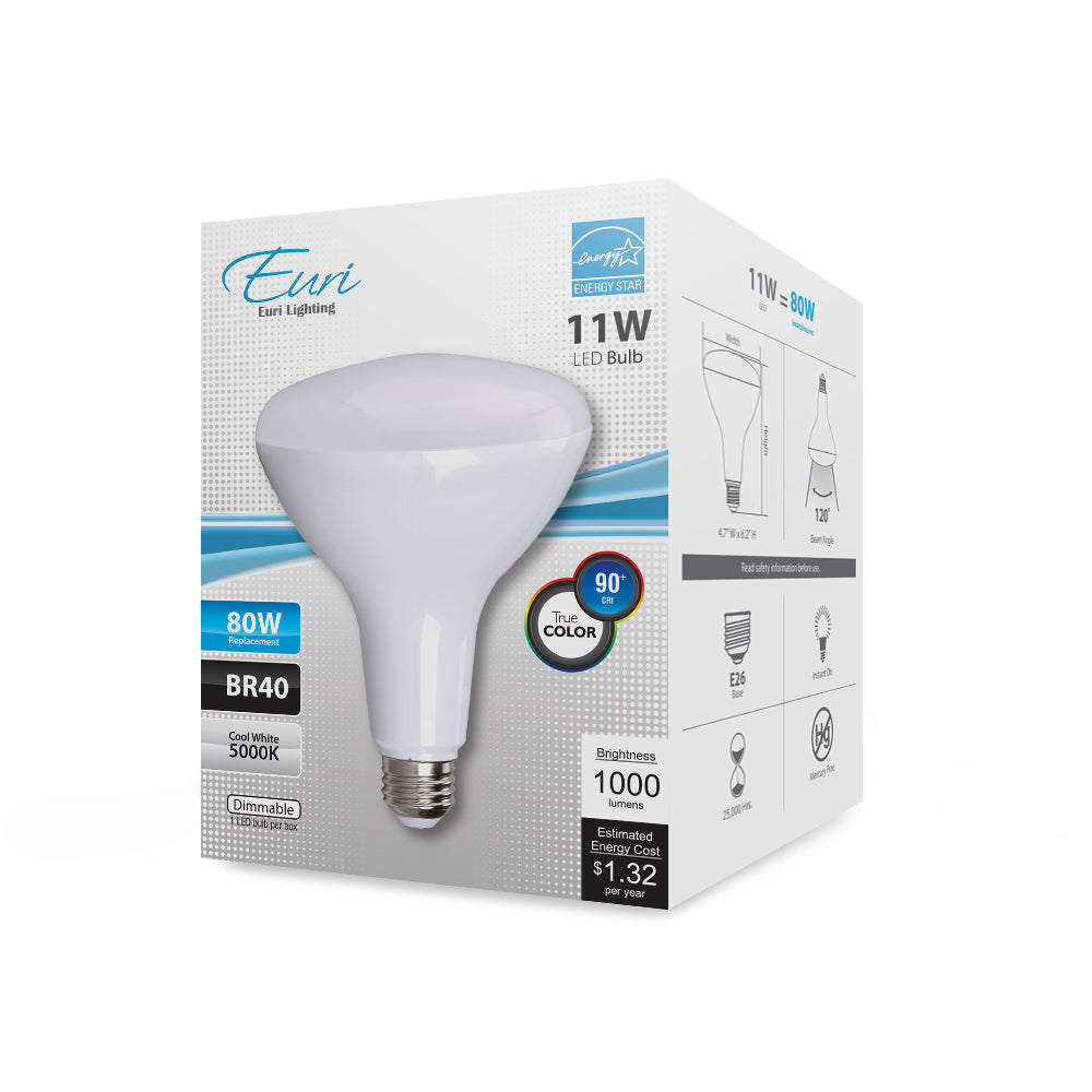 EB40-4050e delivers superior brightness, valuable energy savings, long lasting performance and true color perception. This BR40 LED flood bulb is ideal for ambient lighting due to its uniform *cool white light (5000K) and replaces conventional 80 Watt incandescent light bulbs. Enjoy features such as: instant on, dimming options, shatter resistance, mercury free, 90+CRI and damp rated.