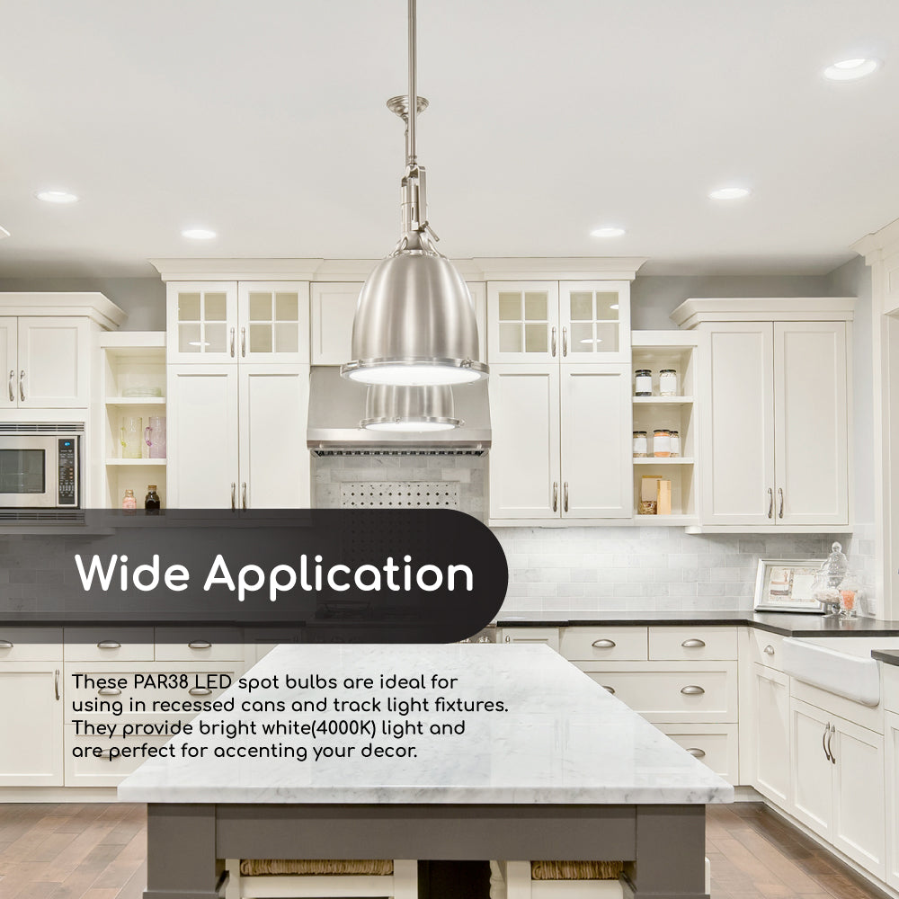 EP38-12W5040cecw-2 delivers superior brightness, valuable energy savings, long lasting performance and true color perception. These PAR38 LED spot bulbs are ideal for task lighting due to its uniform *Bright white light (4000K) and replace conventional 100 Watt incandescent light bulbs. Enjoy features such as: Instant on, dimming options, energy efficient, 90+CRI, and damp rated.